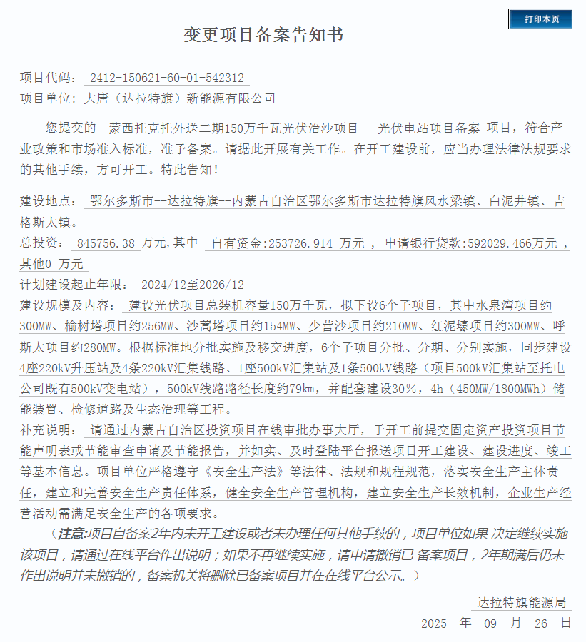近日,内蒙古自治区投资项目在线审批办事大厅发布变更项目告知书,大唐(达拉特旗)新能源有限公司申报的蒙西托克托外送二期150万千瓦光伏治沙项目变更项目备案完成。